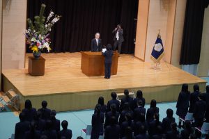 新入生のみなさん、入学おめでとう。保護者の皆様にも心からお祝いを申し上げます。みなさんは今日からの好文学園での新生活に期待と不安で胸いっぱいのことと思います。2月24日(月)の朝、学校に参りますと、校長ポストに小さな赤い封筒が入っていました。開けてみますと、入学試験に合格できた喜びと好文での3年間を楽しみにしている気持ちが綴られていました。21日(土)の学用品販売日に来たときにポストに入れてくれたのだと思いました。私はとても嬉しく思うとともに、新入生の期待に応えるようさらに尽力をしたいと思っています。
