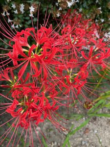 彼岸花が遅ればせながら真っ赤な花をつけています。先月からインフルエンザやコロナの罹患が増えてきました。インフルエンザは冬場のものと思っていましたが、最近では流行が早まっています。