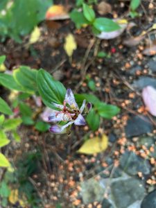 朝、玄関を出ると、昨日の雨で金木犀の花が少し散ってしまっていましたが、そのふもとにホトトギスが花をつけていました。花期は8月から10月とあります。こちらも遅れ気味です。庭の紅葉もかなり進んできました。落ち葉が溜まってきましたがもう少しこのまま秋の風情を楽しみたいと思います。