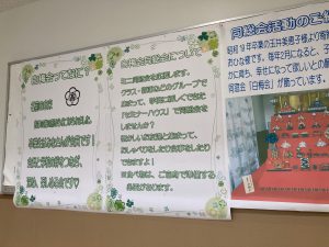 懐かしい制服イラストや寄贈された雛人形の写真、同窓会活動の紹介を掲示しました。