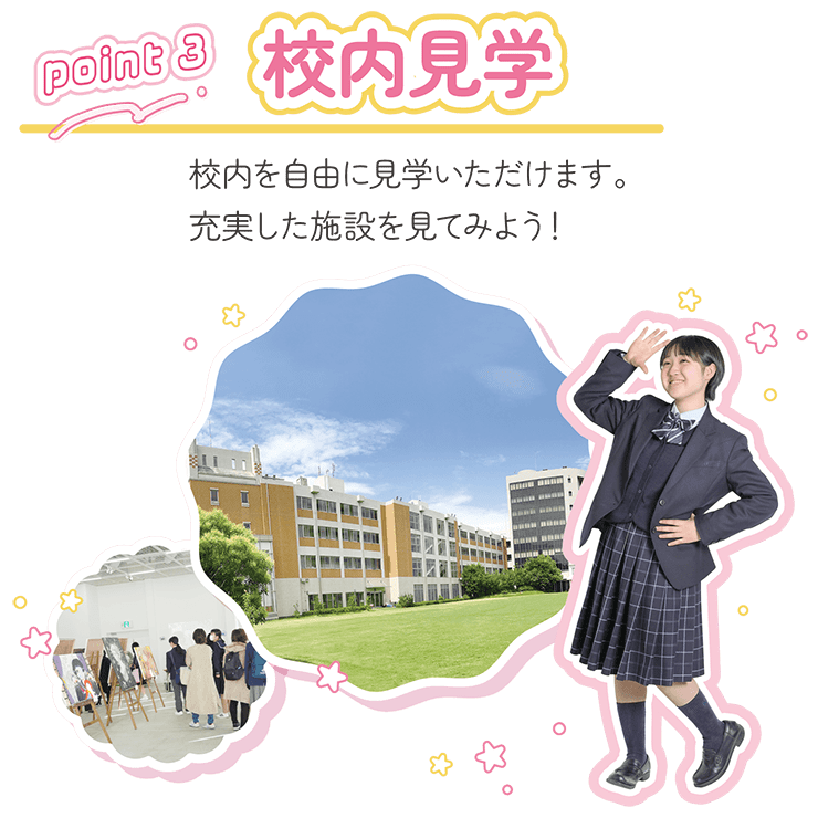 | 12/6(土) | 10:00(9:30~) | 全体説明会 ・生徒による学校紹介 コース別体験会 個別相談会(希望者) 生徒会ブース(希望者) 校内見学(希望者) |